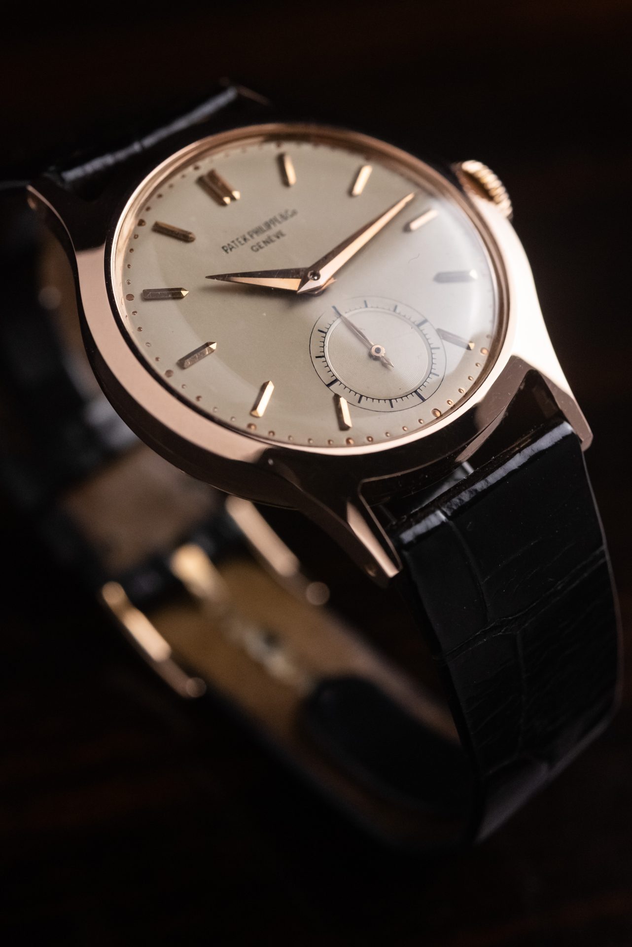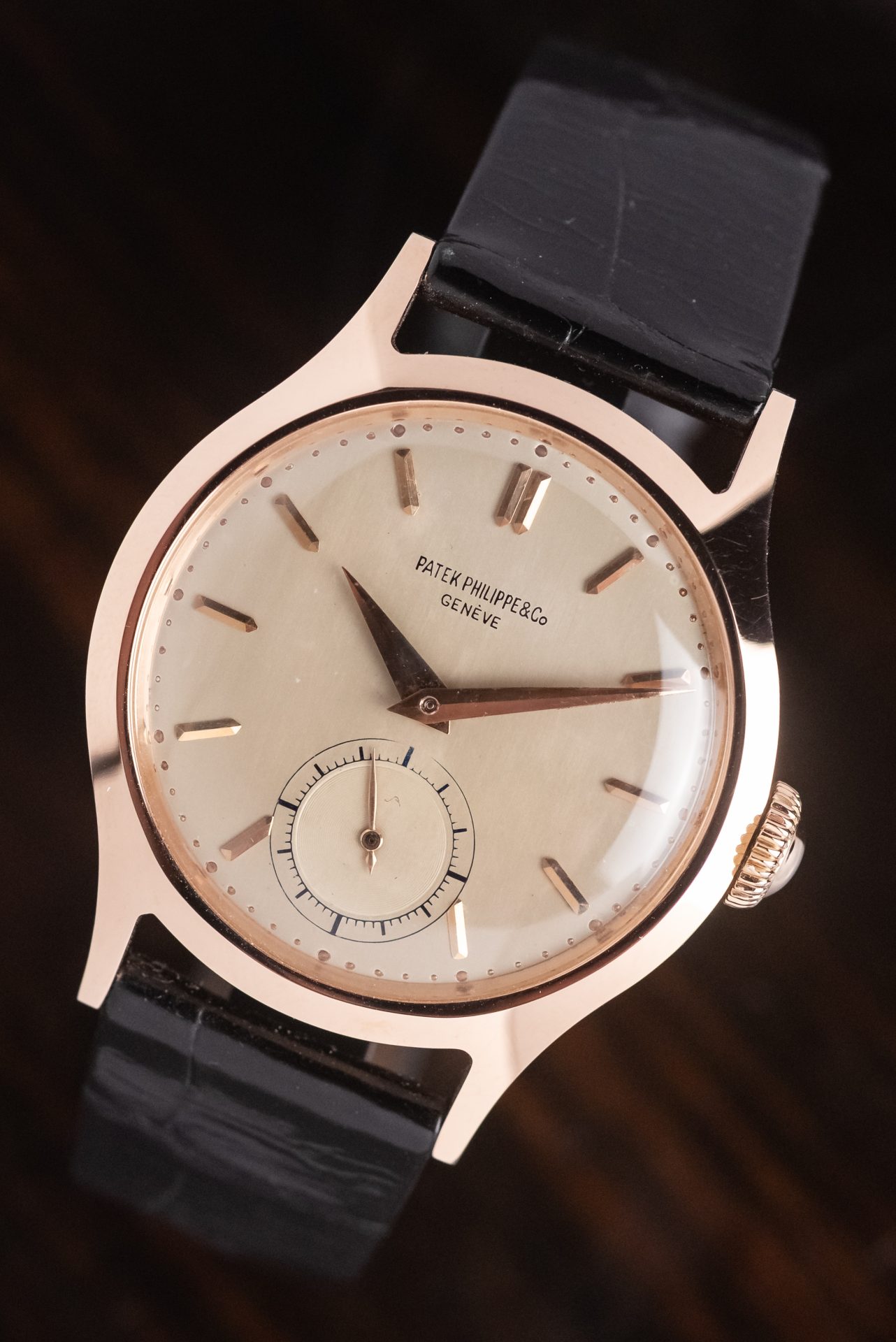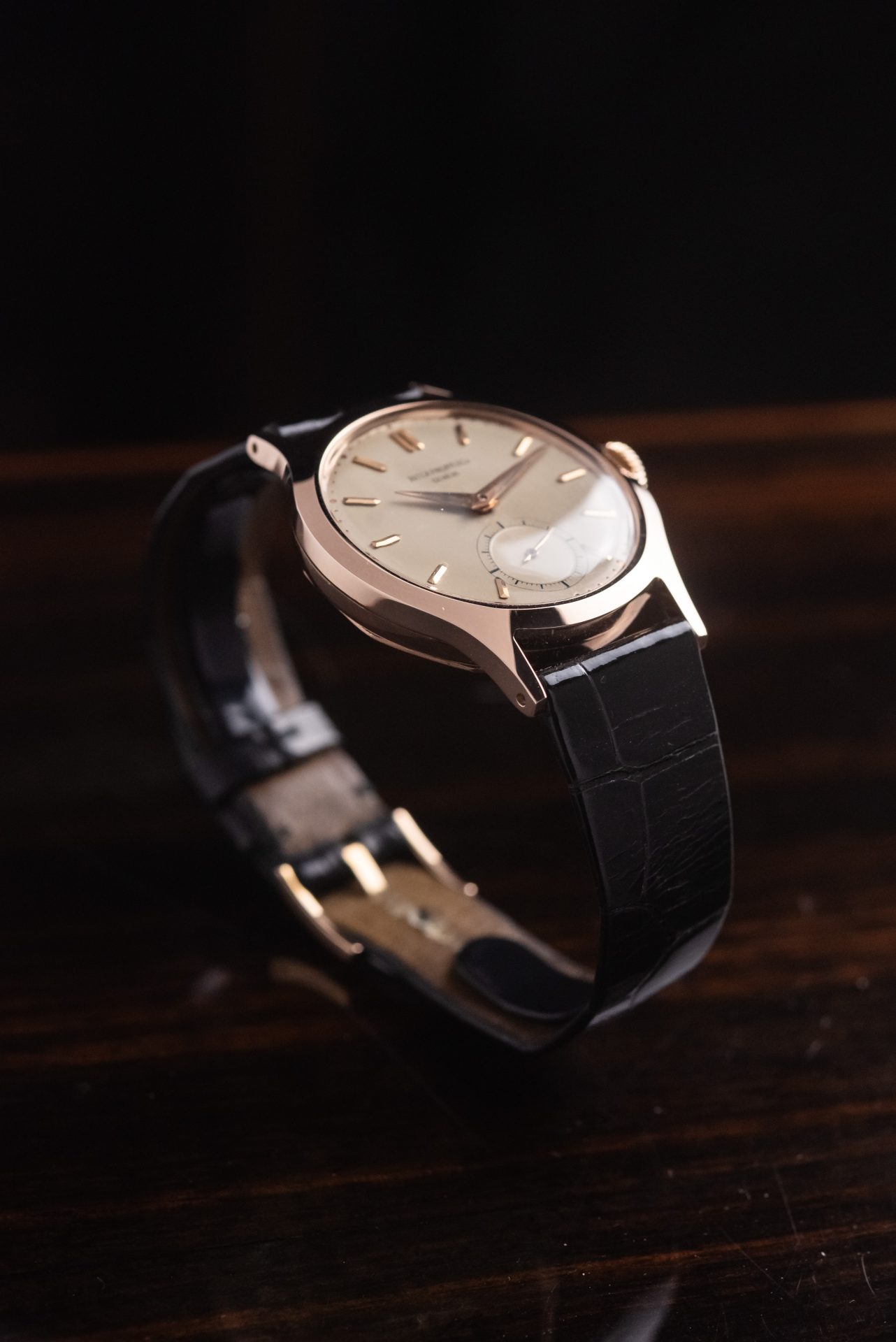 La cassa in oro rosa, dalle proporzioni armoniose e dalla linea sobria ma decisa conservata in straordinarie condizioni, con spigoli ancora ben definiti e superfici che ne testimonia un’eccezionale conservazione nel tempo. Il quadrante originale, elegante e leggibile, è impreziosito da indici applicati applicati e dalla raffinata disposizione dei piccoli secondi a ore 6, dettaglio che dona equilibrio e carattere all’insieme. Le sfere, coerenti per epoca e stile, completano un’estetica senza tempo.