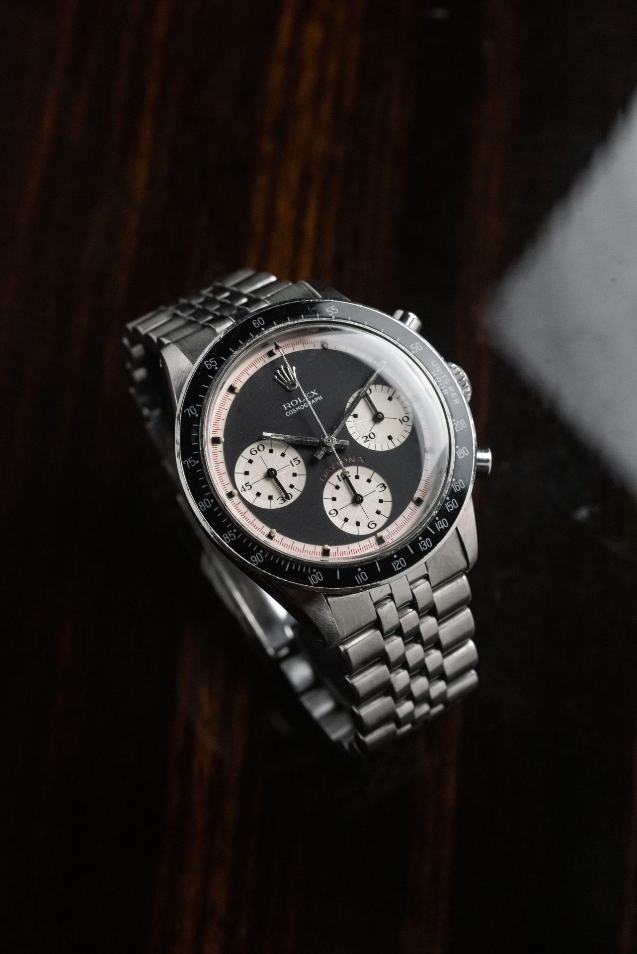 Questo raro Rolex Daytona referenza 6264 si distingue dagli altri quadranti “Paul Newman” per i cerchi concentrici assenti nella parte più esterna dei contatori. L’unione tra limitata produzione di questa referenza e questa particolare e rara configurazione di quadrante, rendono il presente segnatempo estremamente raro e collezionabile.