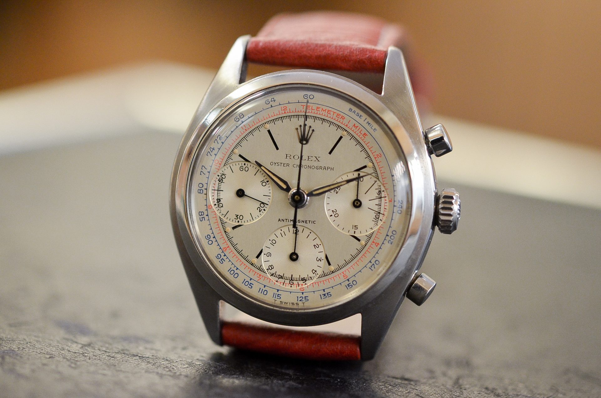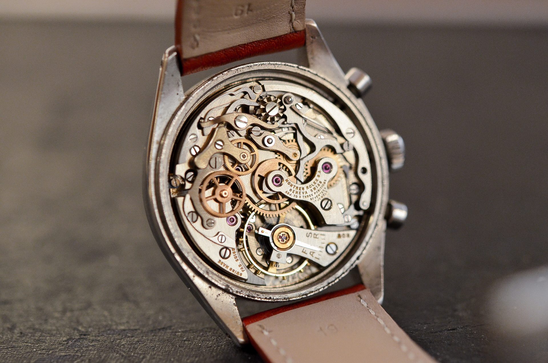 Quadrante argenté con scala rossa e blu perfetto, ghiera liscia in acciaio, pulsanti a pompa, cassa in acciaio in condizioni stupende