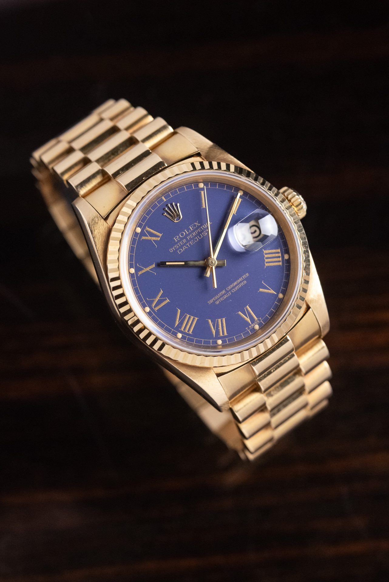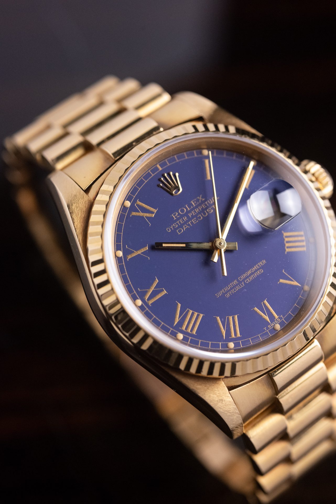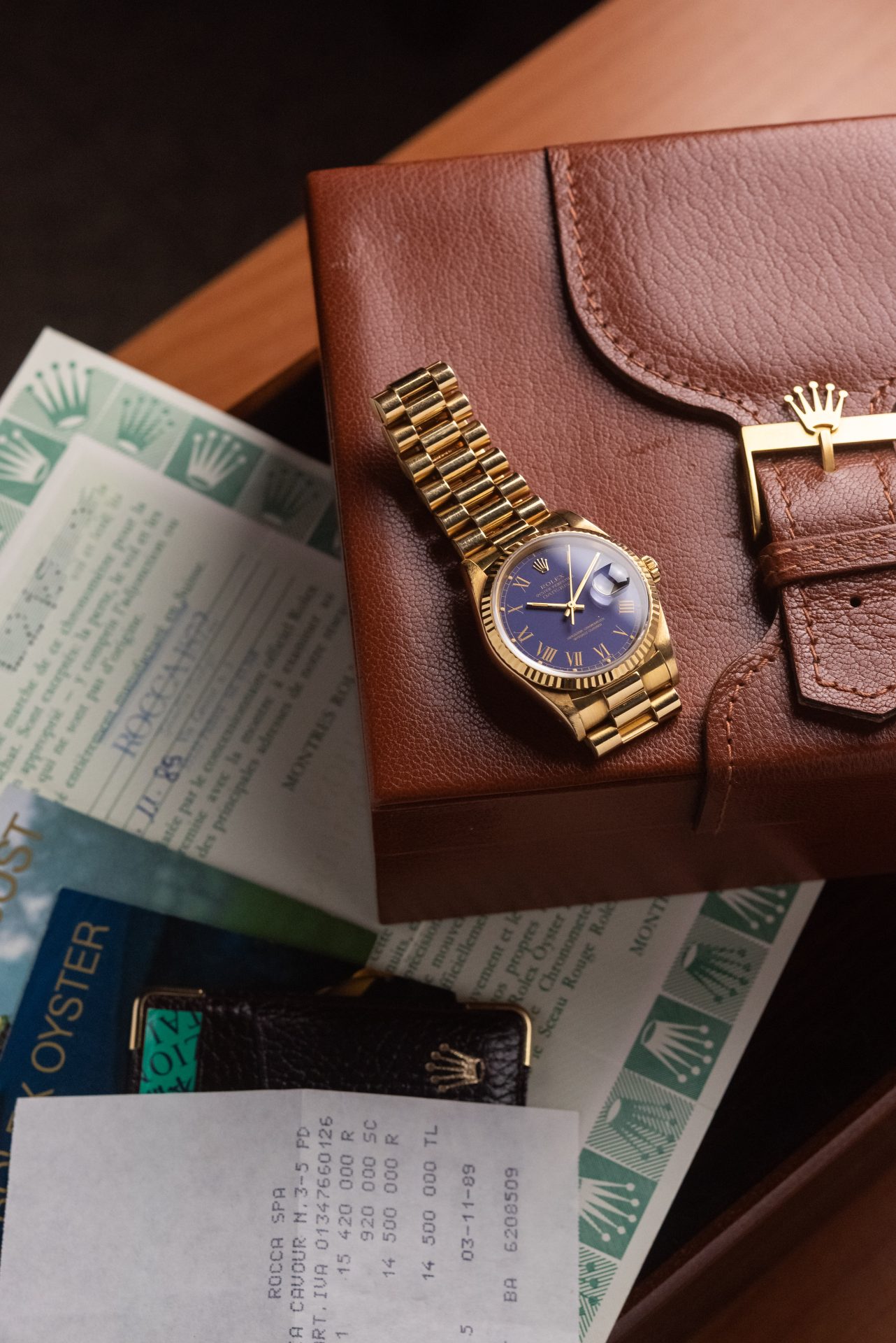 Questo è un Rolex DateJust Ref. 16238, un pezzo iconico degli anni ’80. Realizzato interamente in oro giallo 18K, si distingue per il suo quadrante Buckley con i numeri romani e lancette dorate che ne esaltano l’eleganza classica, questo segnatempo è dotato di tutto il suo corredo originale dell’epoca con scatola, garanzia e scontrino d’acquisto dell’epoca presso la storica gioielleria Rocca di Padova. Un esemplare che racchiude fascino, storia e autenticità, perfetto esempio del prestigio e della raffinatezza firmati Rolex.