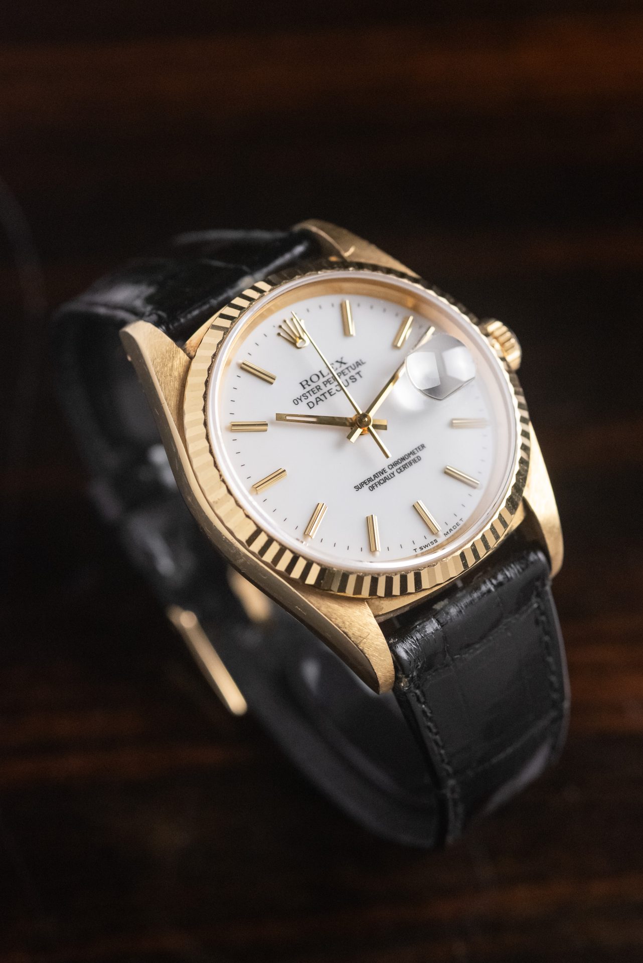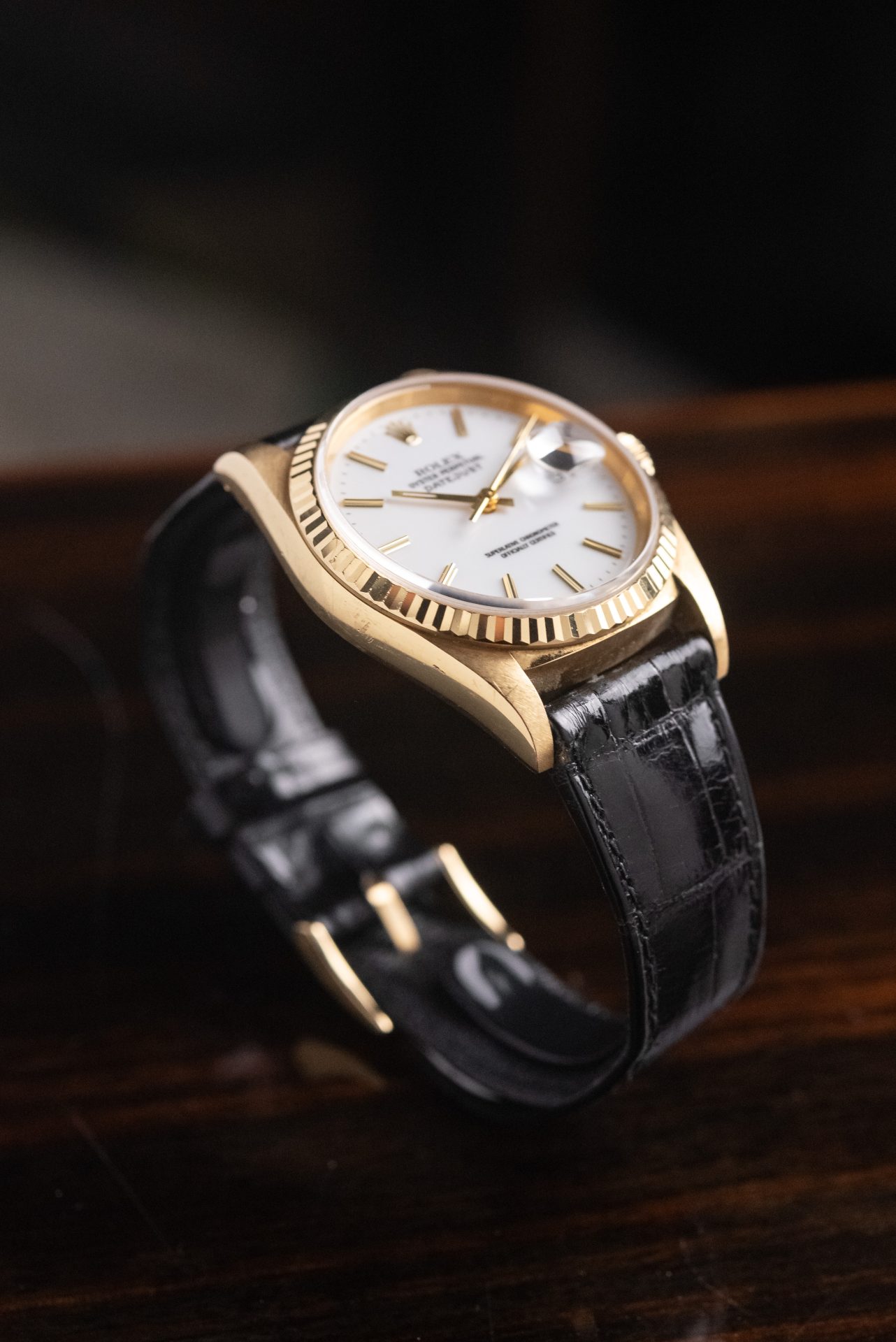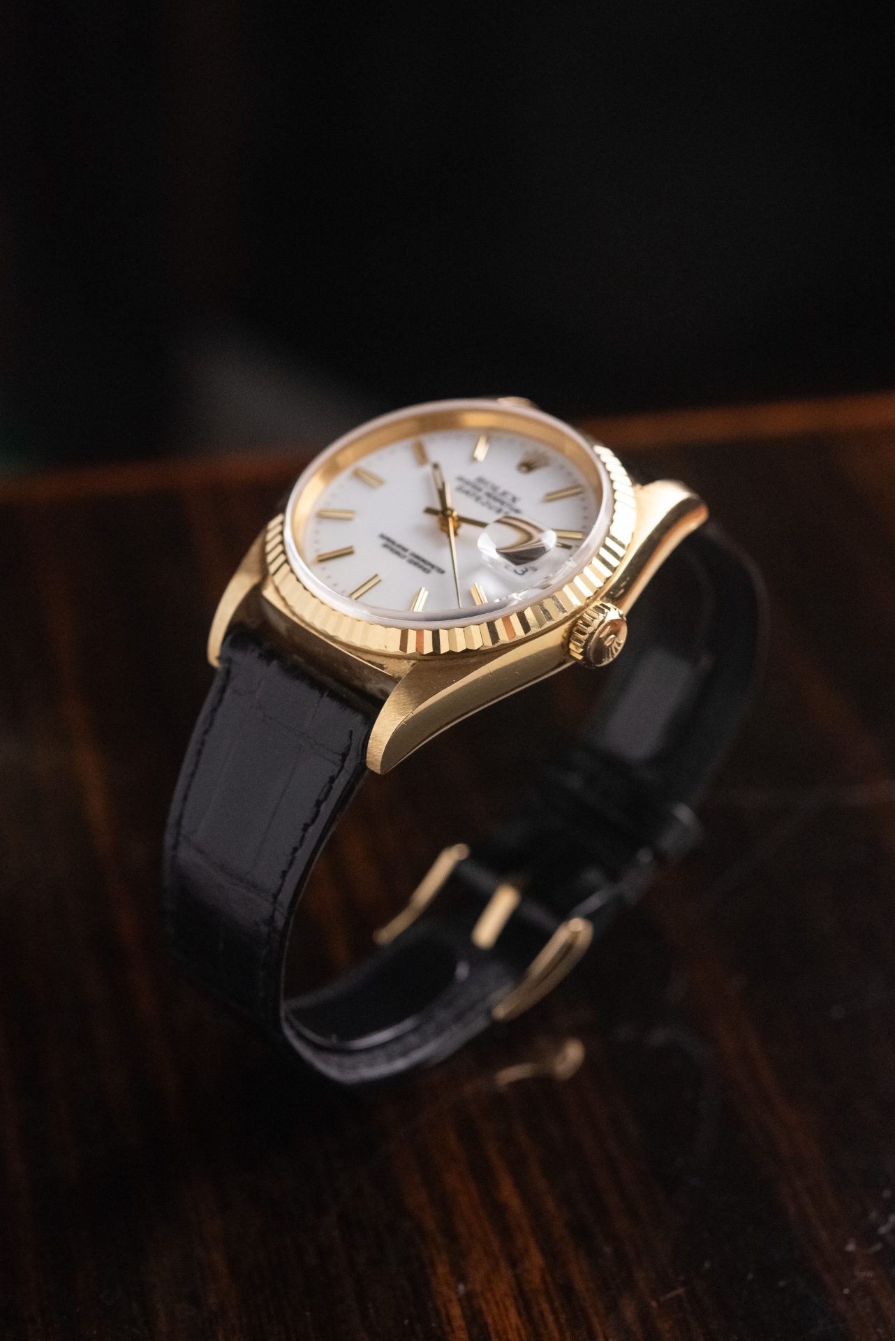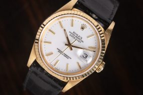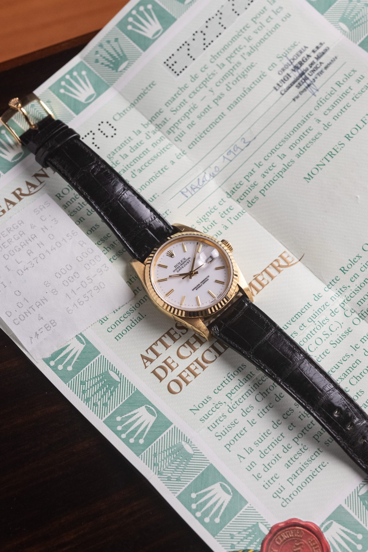 Questo elegante Rolex DateJust Ref. 16238 del 1993 rappresenta una delle versioni più raffinate del classico modello in oro giallo 18K. Il quadrante bianco con indici a bastone dorati e la lunetta zigrinata donano un equilibrio perfetto tra sobrietà e prestigio. L’orologio è Full Set, completo di scatola, garanzia e documenti originali dell’epoca. Particolarità rara e affascinante: conserva ancora il bollino verde di vendita applicato sul fondello, dettaglio che ne testimonia l’originalità e lo stato di conservazione eccellente. Un vero gioiello per intenditori e collezionisti di orologi d’epoca.