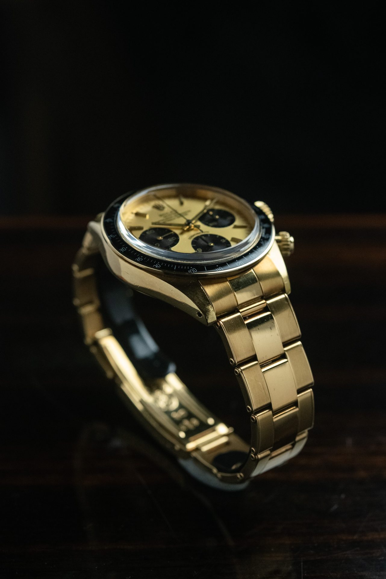 Quadrante champagne con contatori a contrasto, ghiera acrilica nera, pulsanti a vite, cassa e bracciale in oro giallo in ottime condizioni