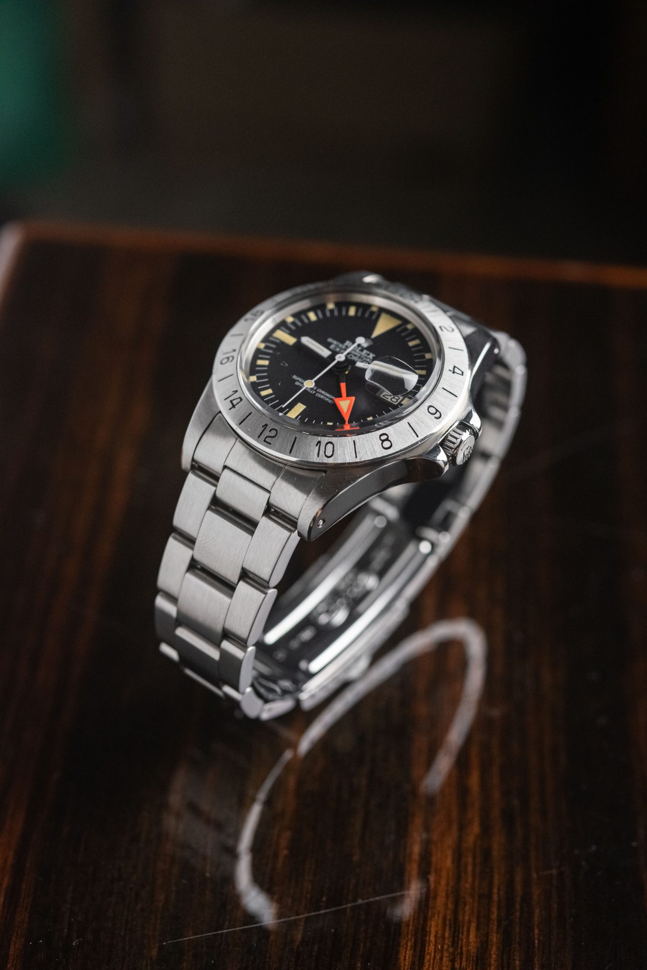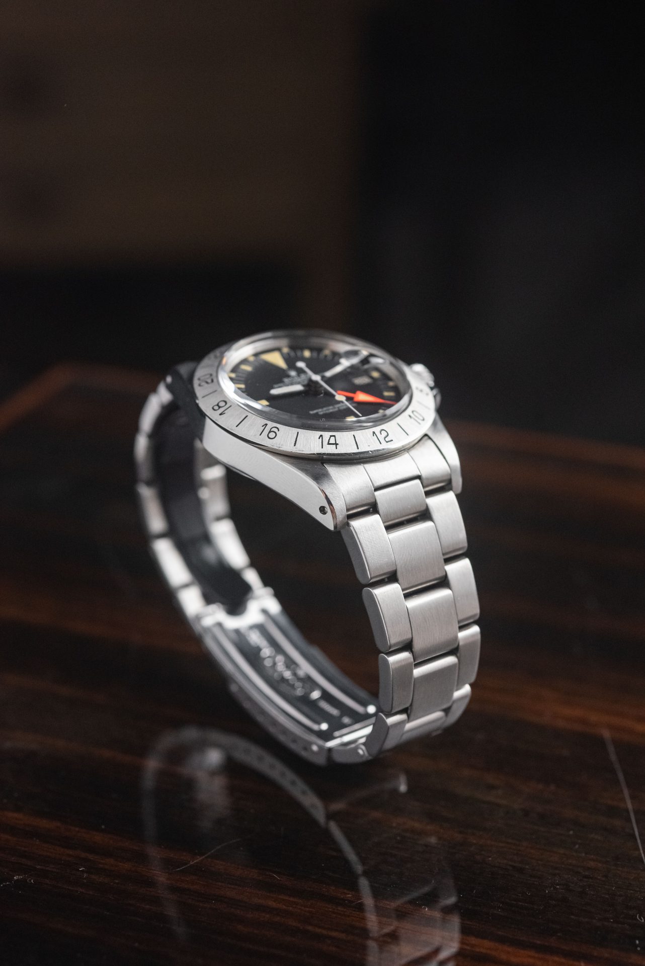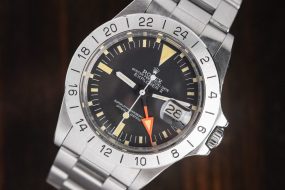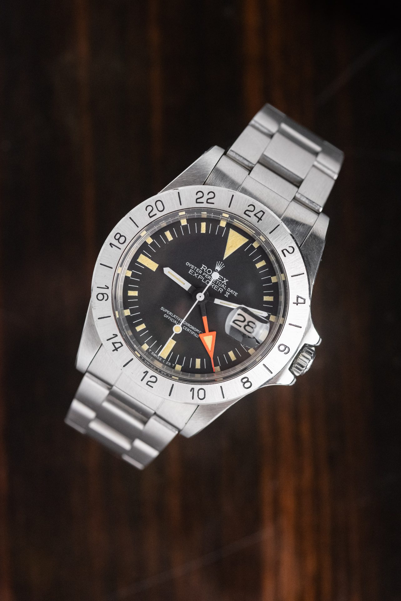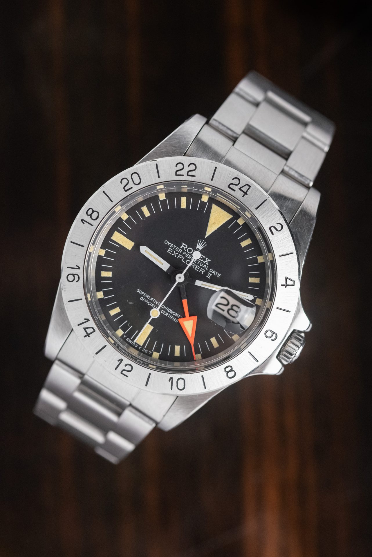 Magnifico Rolex Explorer II 1655 del 1982 nella celebre configurazione detta Freccione per la caratteristica lancetta Gmt arancione. Modello iconico e oggi molto ricercato, rappresenta una delle referenze più affascinanti della produzione sportiva vintage Rolex.