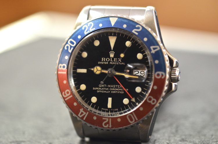 Rolex GMT Master in acciaio con quadrante speciale Referenza 1675 Seriale 1.2xx.xxx Quadrante nero gilt specchiato grafica oro, cassa e bracciale in acciaio in ottime condizioni Meccanica a carica automatica di calibro 1560